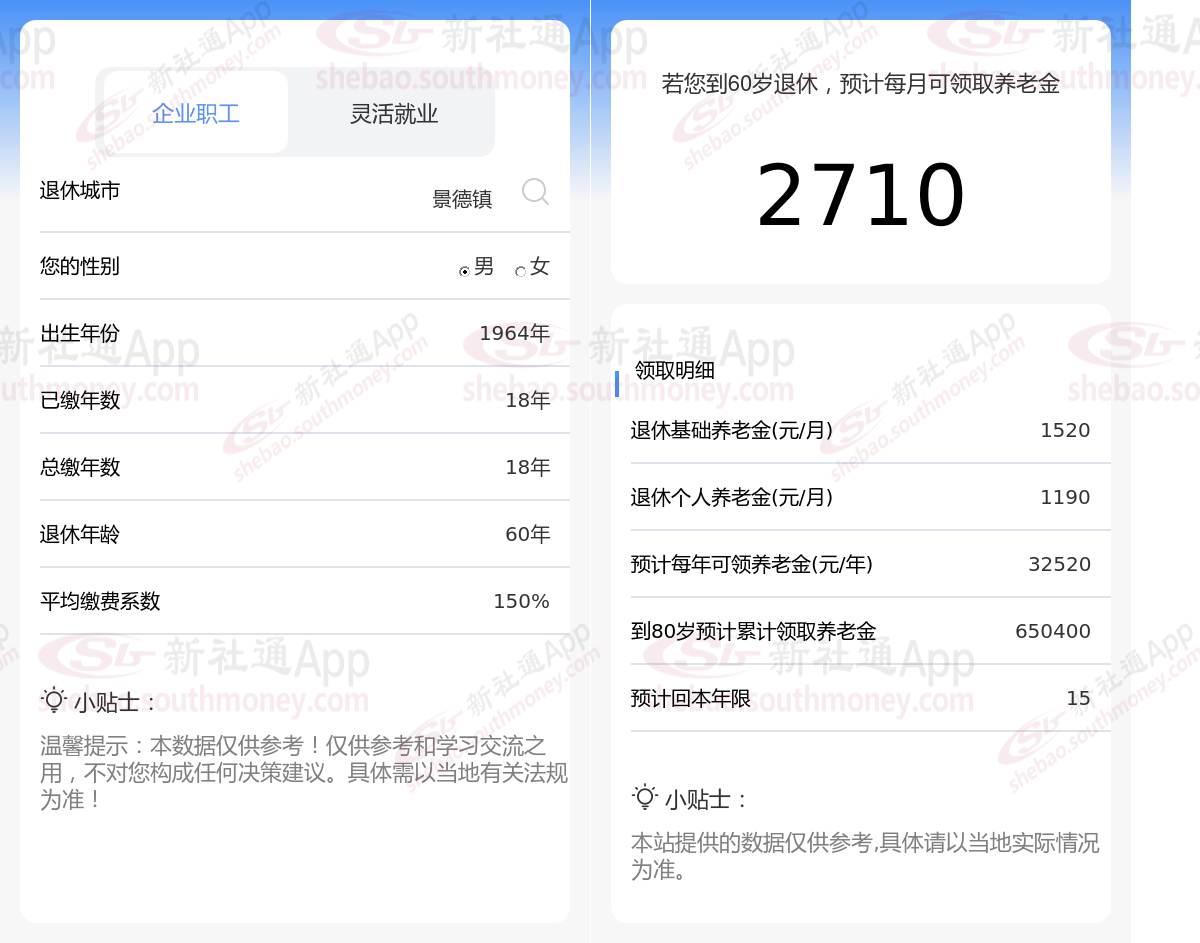 退休城市:江西景德镇,性别:男,出生年份:1964,总缴年数18年,缴费档次:150%,新社通app养老金计算器所得: