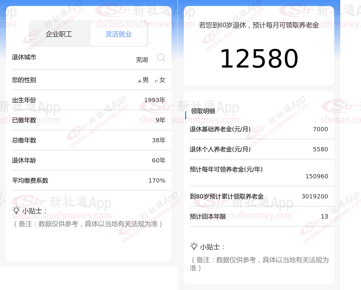 通过新社通APP-养老金计算所得:退休城市、出生年份、退休年龄、缴费系数都相同的情况下,社保缴费年限累计38年时,计算如下: