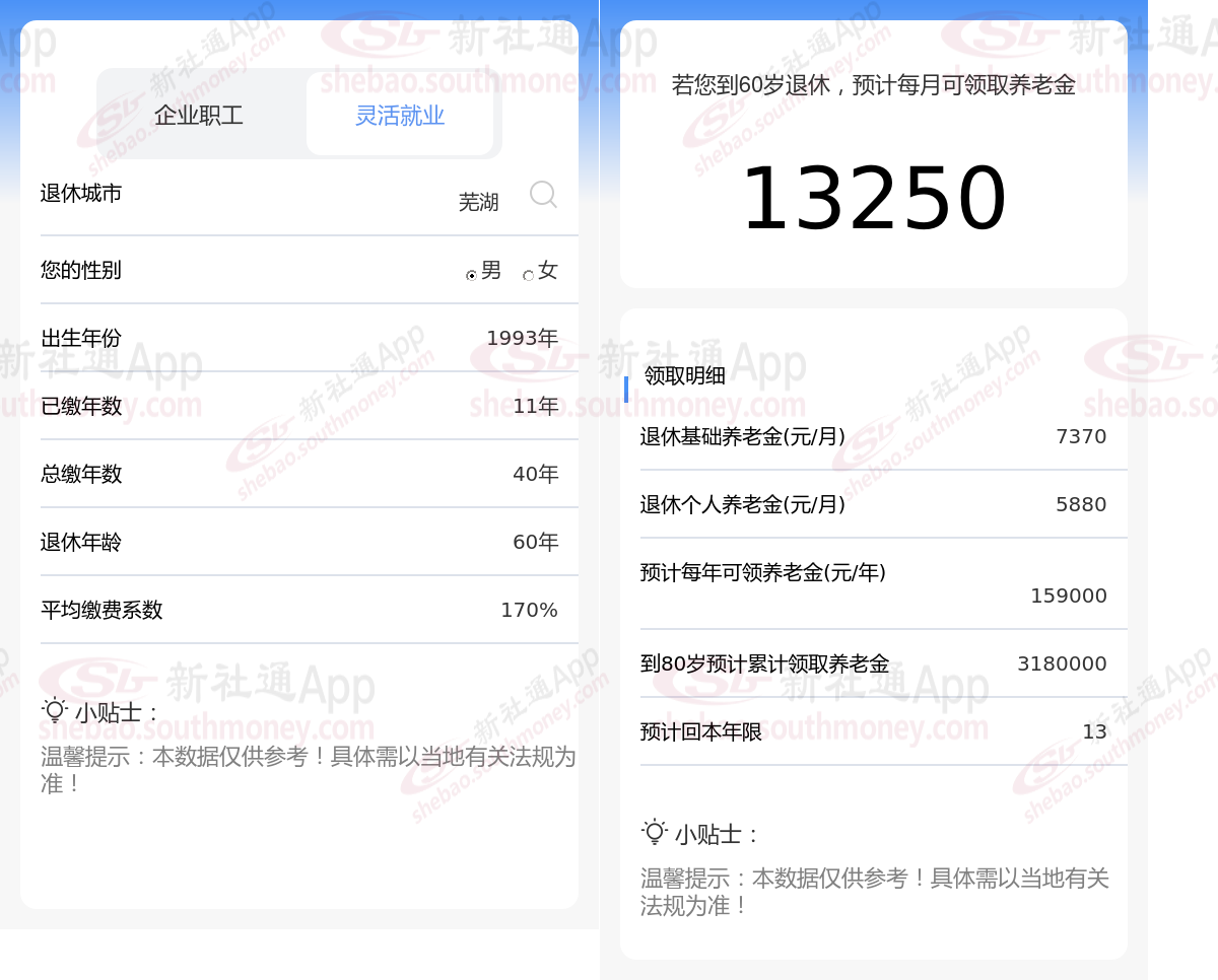 通过新社通APP-养老金计算所得:退休城市、出生年份、退休年龄、缴费系数都相同的情况下,社保缴费年限累计40年时,计算如下: