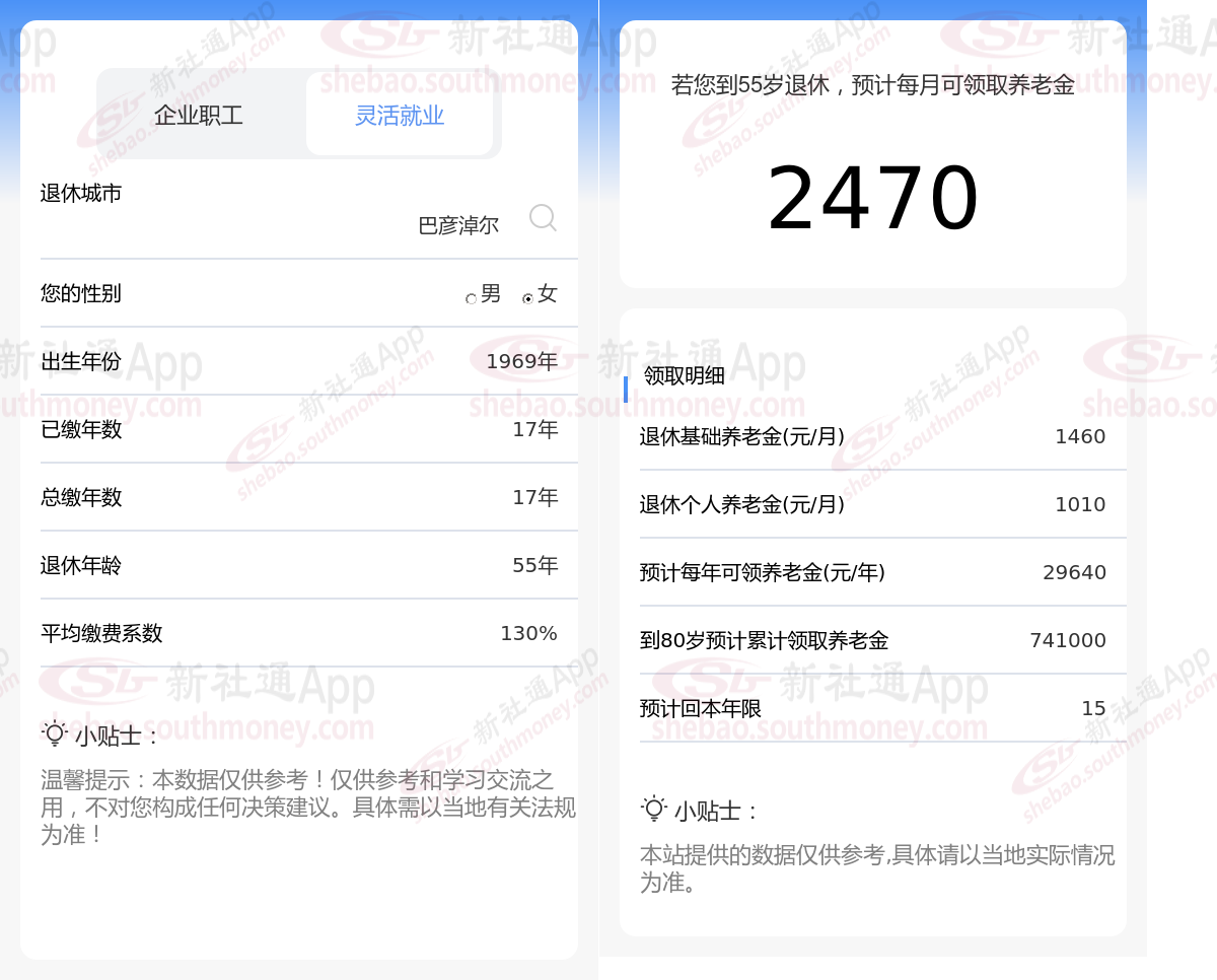 退休城市:内蒙古巴彦淖尔,性别:女,出生年份:1969,总缴年数17年,缴费档次:130%,新社通app养老金计算器所得: