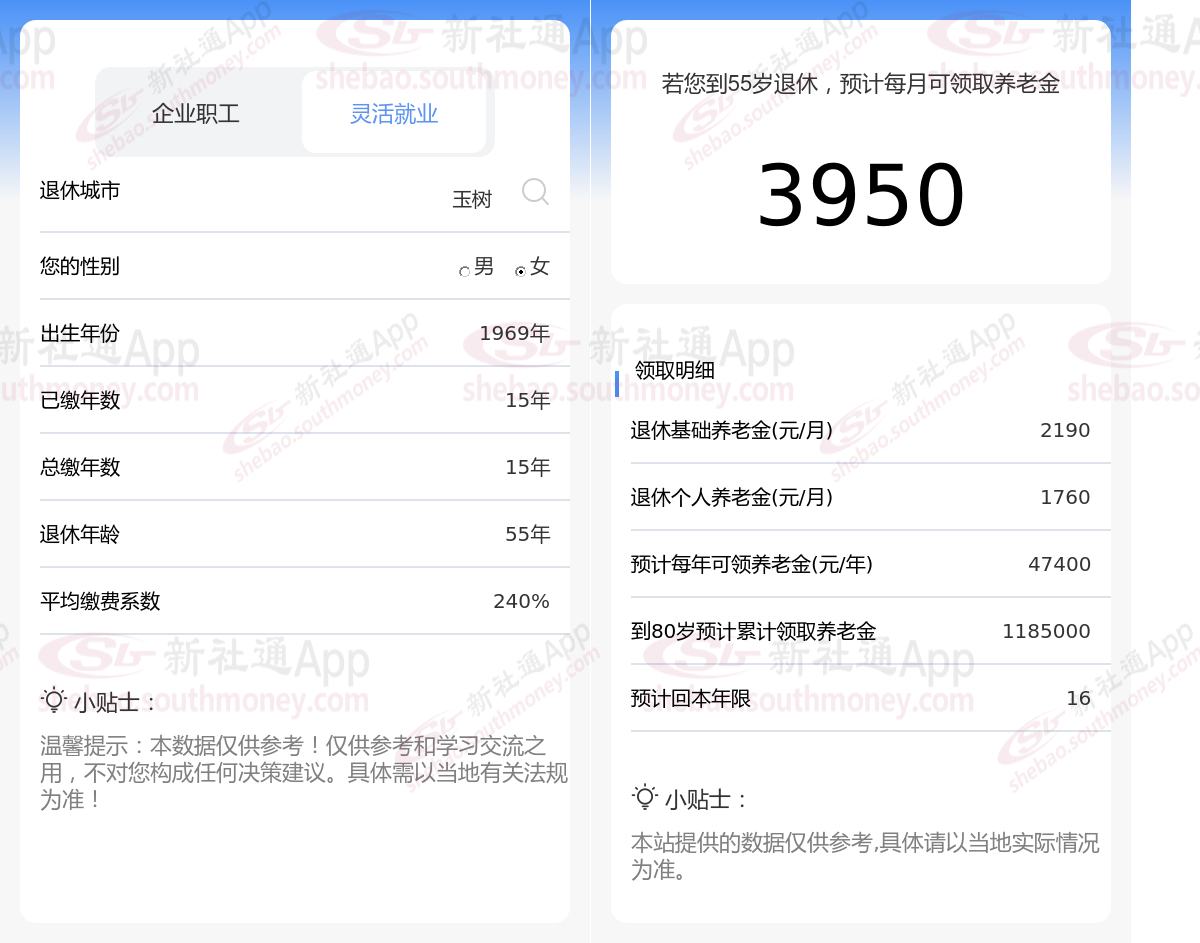 魏某沈某退休城市在青海玉树,性别:女,出生年份:1969,总缴年数15年,缴费档次:240%,新社通app养老金计算器所得: