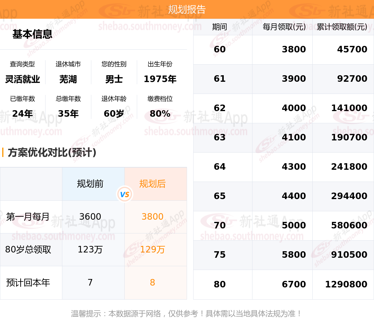 规划前:60岁第一个月约领3600元,新社通APP-养老金规划后:60岁第一个月约领3800元