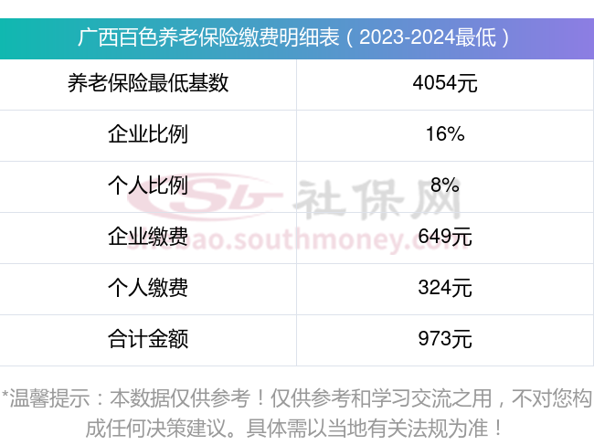 据新社通app获悉,广西百色的养老保险缴费金额因个人情况而异,包括个人缴费基数、缴费比例等因素。以下是一些参考信息: