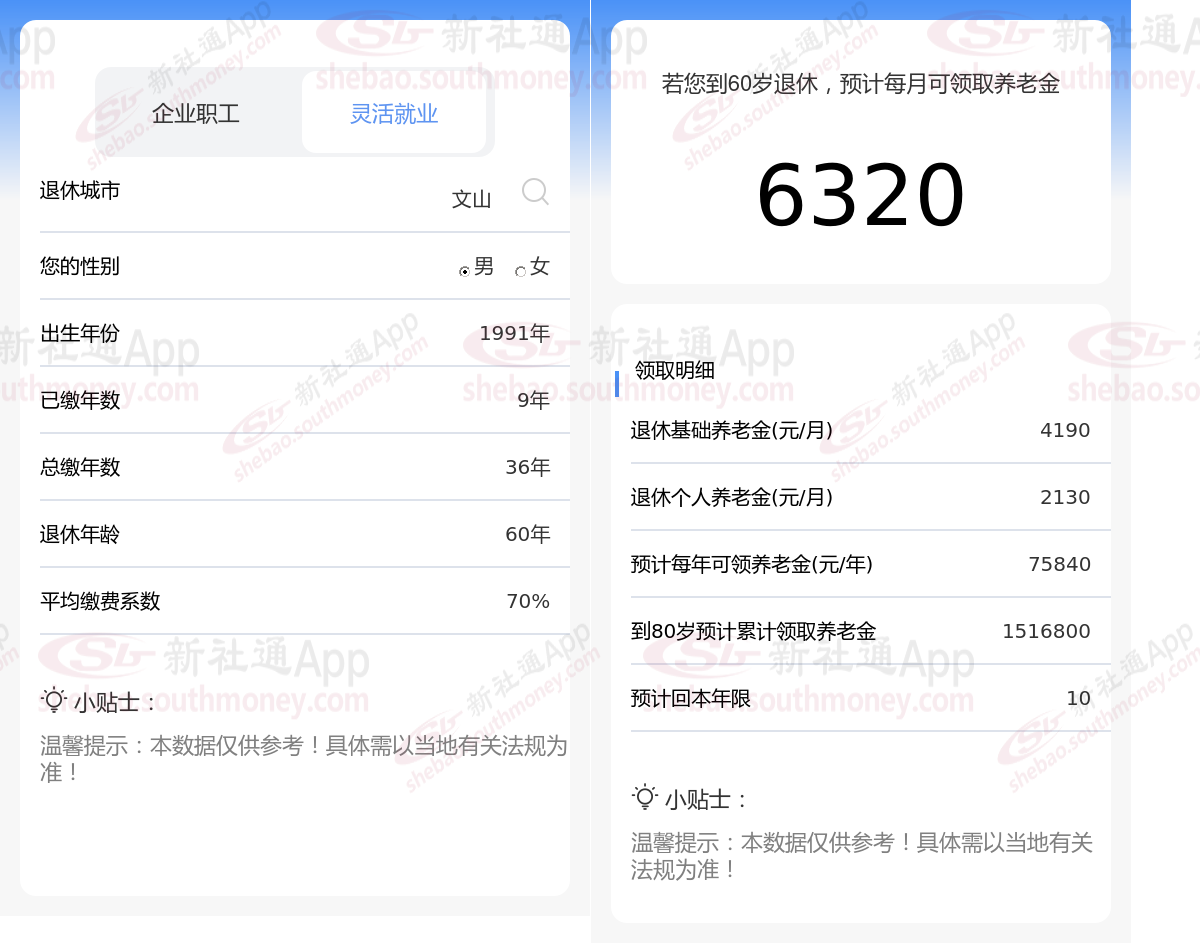 通过新社通APP-养老金计算所得:在保持退休城市、出生年份、退休年龄以及缴费系数这些条件不变的前提下,当个人的社保缴费年限累积达到36年时,其相关计算方式如下: