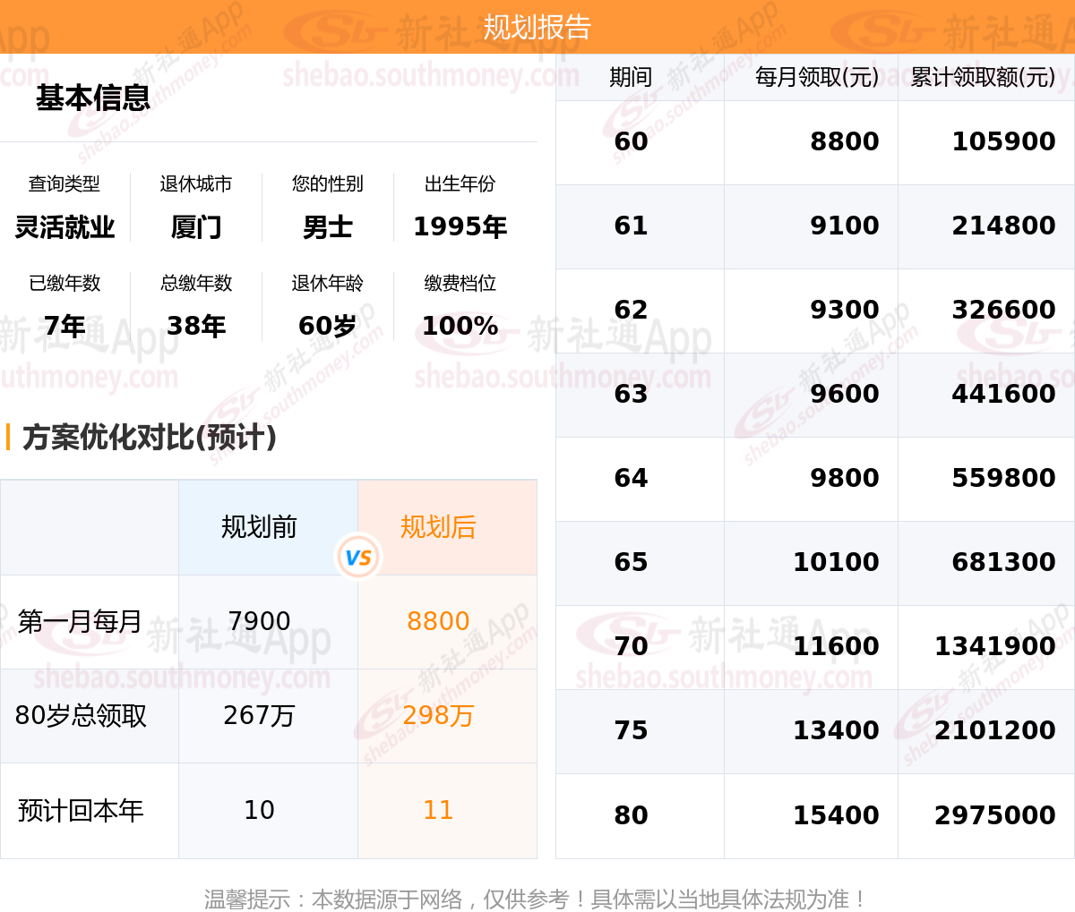 规划前:60岁第一个月约领7900元,新社通APP-养老金规划后:60岁第一个月约领8800元