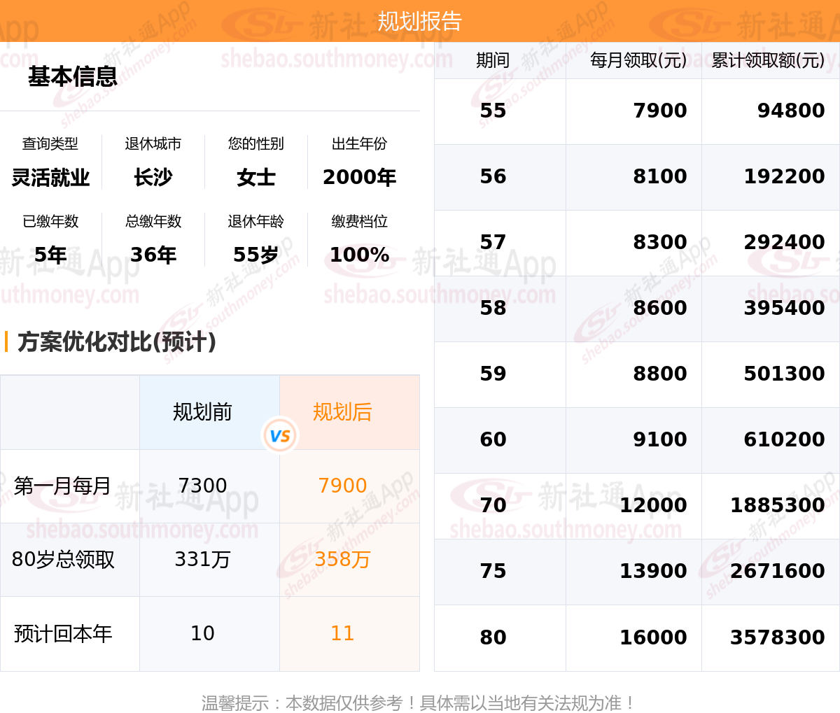 规划前:55岁第一个月约领7300元,新社通APP-养老金规划后:55岁第一个月约领7900元