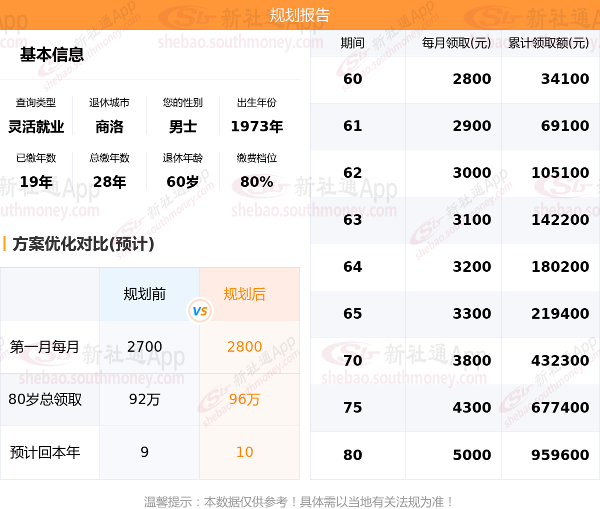 规划前:参保城市:陕西商洛,性别:男士,出生年月:1973,已缴年限:19年,总缴年数:28年,退休年龄:60岁,缴费档位:80%。