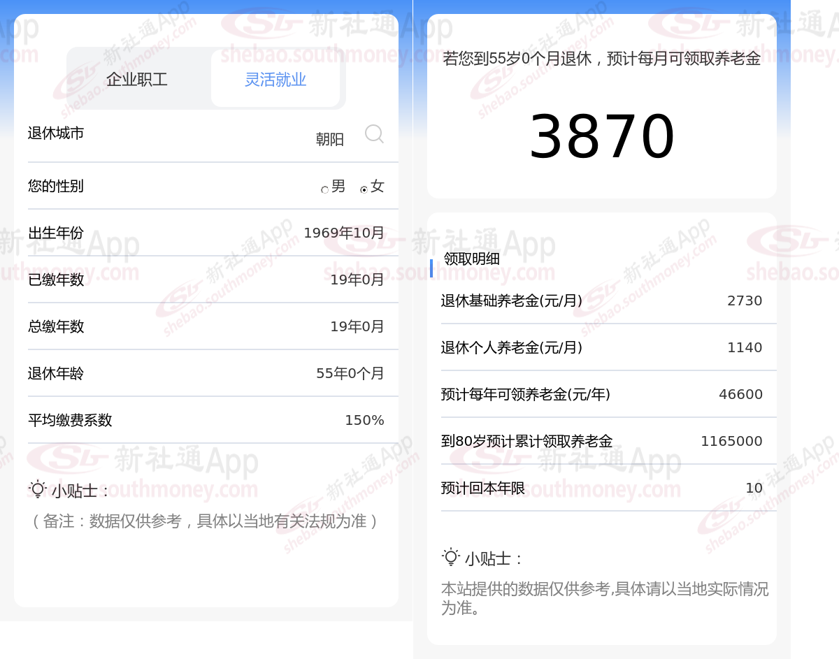 退休城市:北京朝阳,性别:女,出生年份:1969,总缴年数19年,缴费档次:150%,新社通app养老金计算器所得: