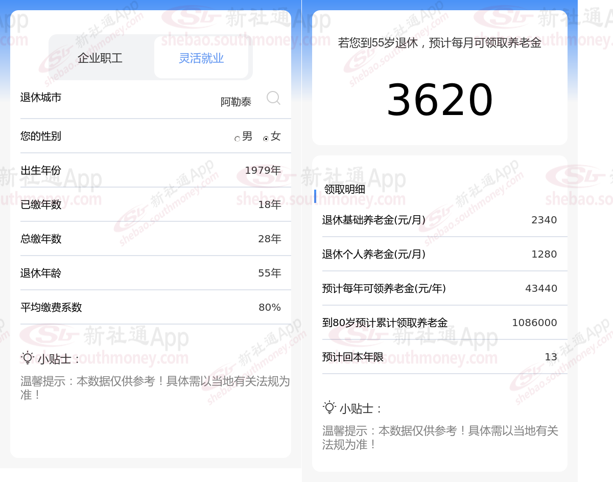 通过新社通APP-养老金计算所得:假设都在新疆阿勒泰退休、出生年份、退休年龄和缴费系数均保持不变的情况下,若个人的社保缴费年限累计达到19年,那么其相关计算方式如下: