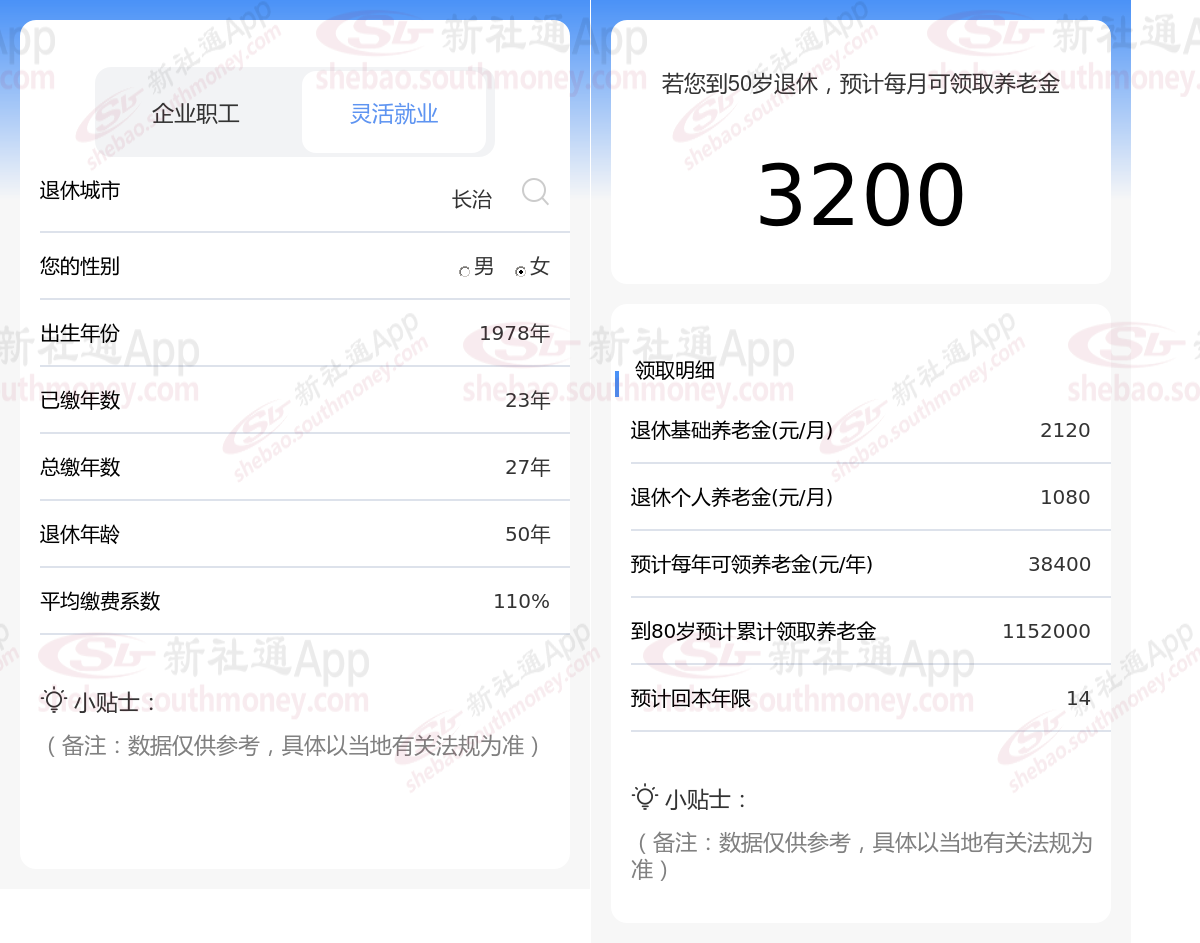 通过新社通APP-养老金计算所得:假设都在山西长治退休、出生年份、退休年龄和缴费系数均保持不变的情况下,若个人的社保缴费年限累计达到27年,那么其相关计算方式如下: