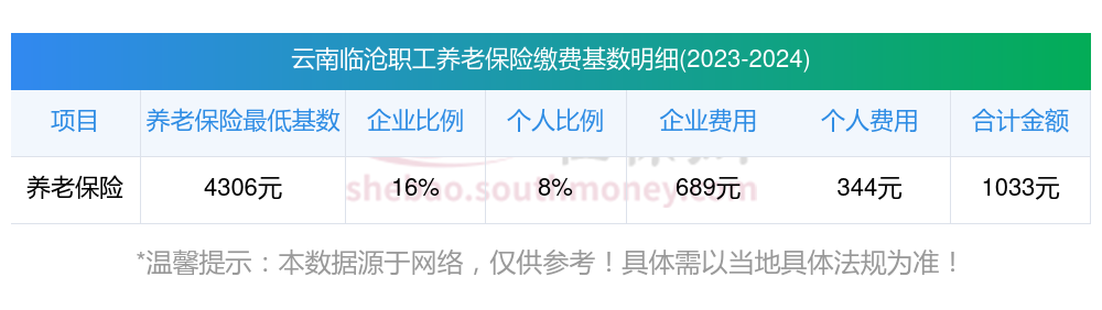 假设云南临沧某职工的养老保险缴费基数为4306元,企业缴费比例为16%,职工个人缴费比例为8%。