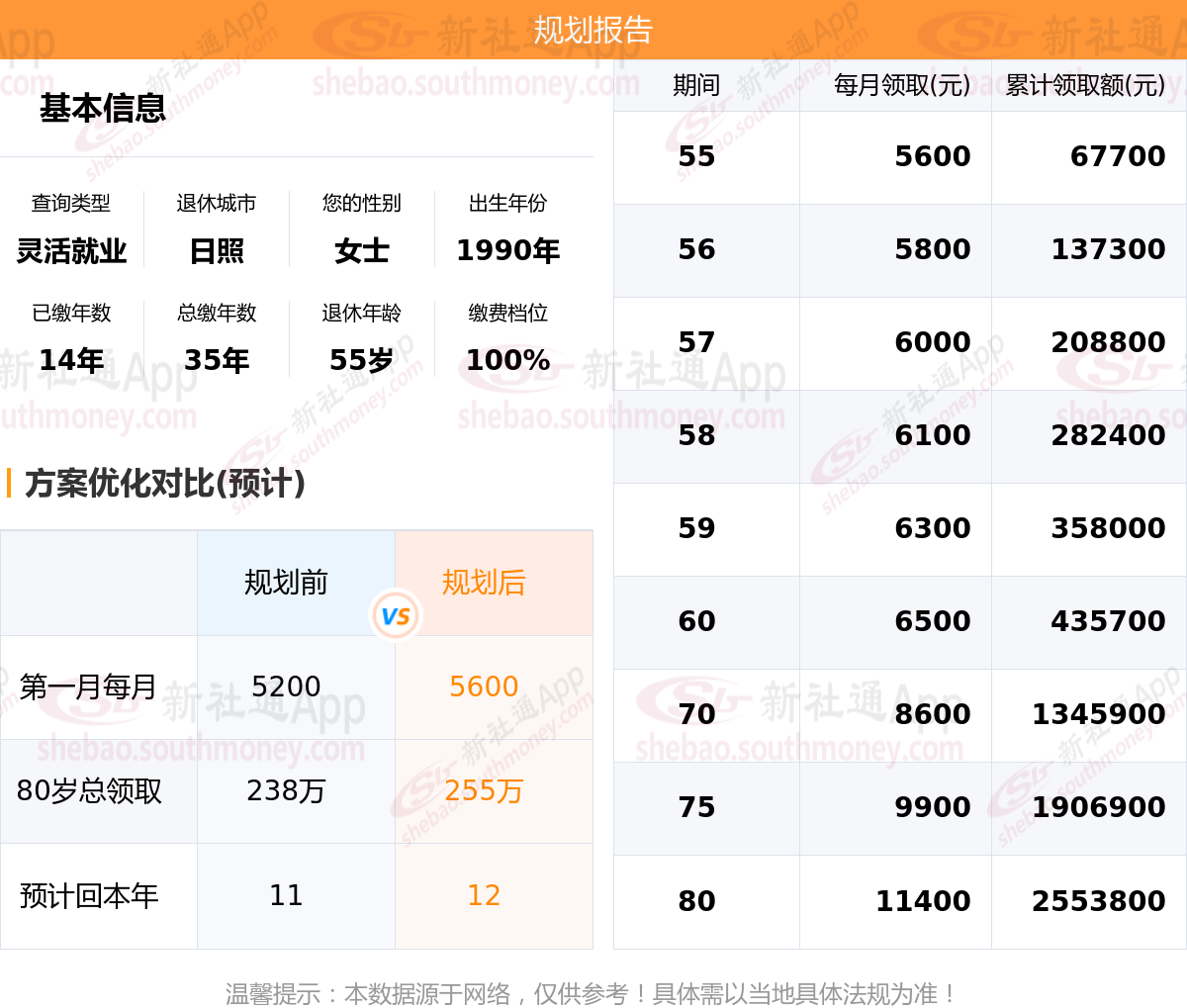 规划前:55岁第一个月约领5200元,新社通APP-养老金规划后:55岁第一个月约领5600元