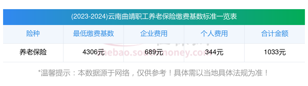 云南曲靖养老保险缴费基数2023-2024最新标准如下