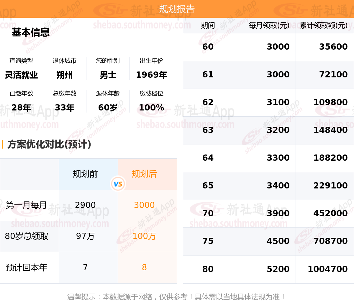 规划前:参保城市:山西朔州,性别:男士,出生年月:1969,已缴年限:28年,总缴年数:33年,退休年龄:60岁,缴费档位:100%。