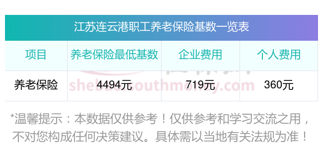 假设江苏连云港某企业职工小明的月工资为4494元,当地的养老保险缴费基数为4494元。据新社通app养老保险计算器显示: