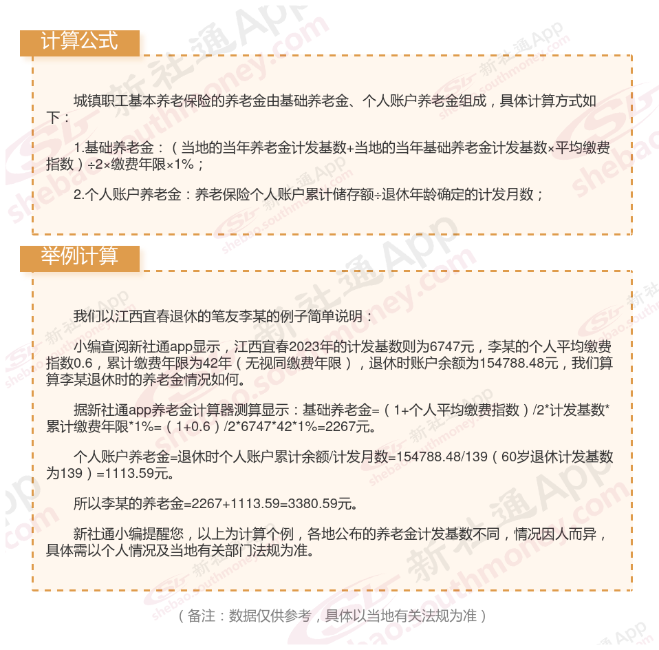 据新社通app获悉,江西宜春养老保险缴费金额的计算通常基于缴费基数和缴费比例。以下是一个具体的计算举例: