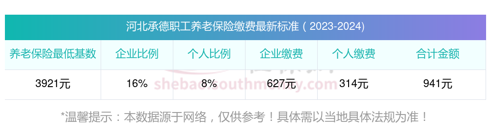 假设河北承德某职工的养老保险缴费基数为3920.55元,企业缴费比例为16%,职工个人缴费比例为8%。