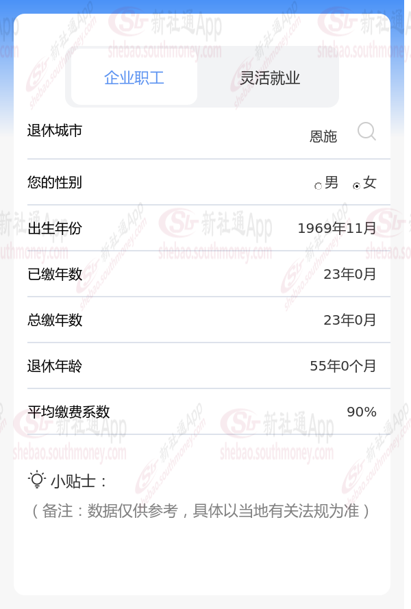 杨某,一位1969年出生的女性,现已在恩施退休的情况,他的养老保险详情及预计养老金计算如下: