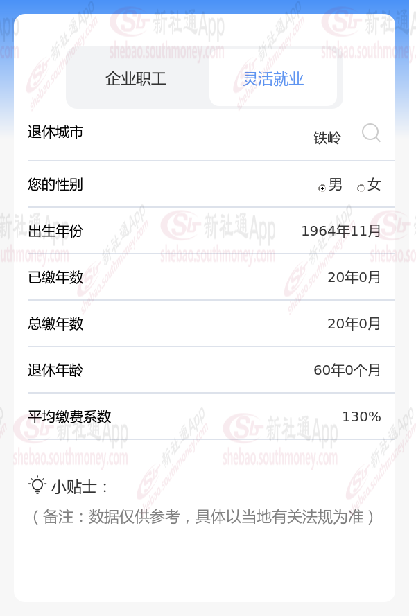 铁岭的一位男性灵活就业退休人员向我们发起了咨询。他出生于1964年,工龄长达20年,一直以来他都按照130%档位缴纳养老保险。他十分关心自己退休后每月能领取的养老金数额,并询问我们根据他的情况,养老金是否能超过2700元。