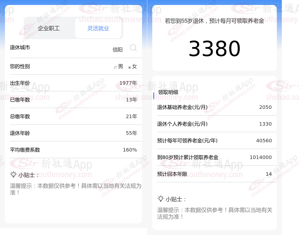 通过新社通APP-养老金计算所得:在保持退休城市、出生年份、退休年龄以及缴费系数这些条件不变的前提下,当个人的社保缴费年限累积达到21年时,其相关计算方式如下: