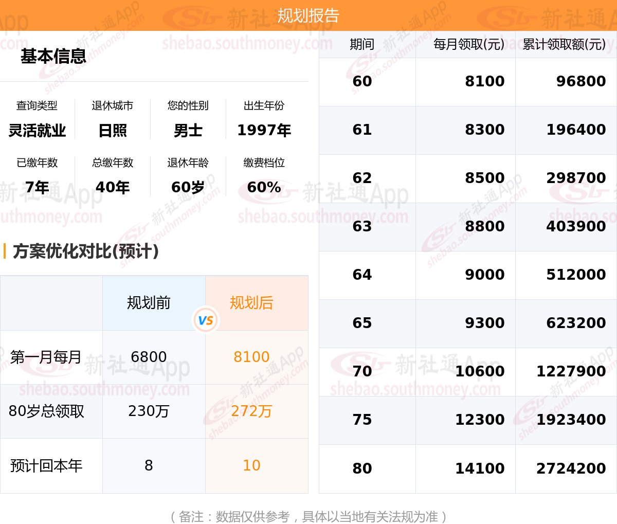 规划前:参保城市:山东日照,性别:男士,出生年月:1997,已缴年限:7年,总缴年数:40年,退休年龄:60岁,缴费档位:60%。