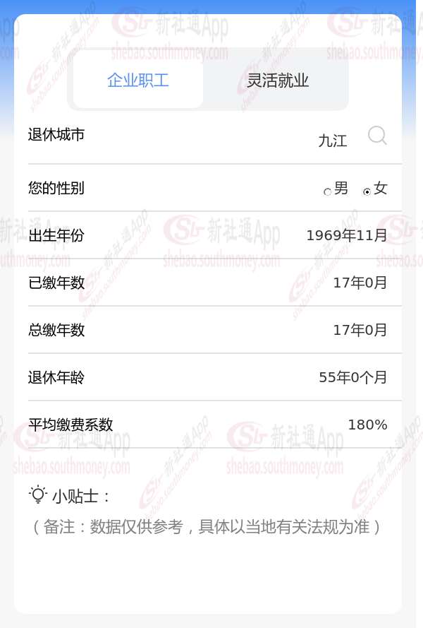 朋友吕某退休城市在九江,性别:女,出生年份:1969,总缴年数17年,缴费档次:180%,新社通app养老金计算器所得: