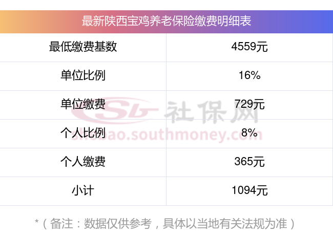 据新社通app显示,陕西宝鸡职工养老保险最低缴费基数为:4559元;单位和个人的缴费比例分别为:16%、8%;