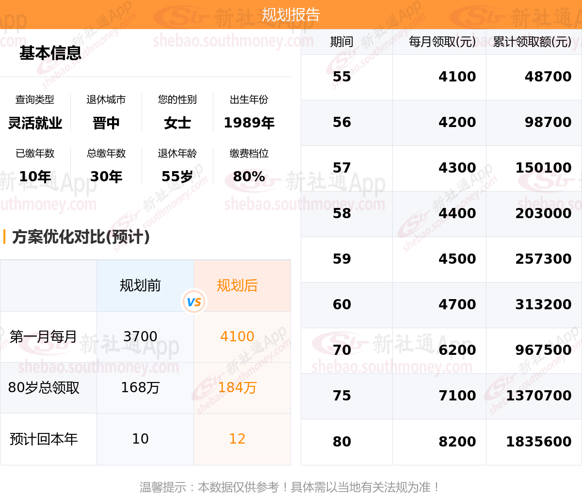 参保城市:山西晋中,性别:女士,出生年月:1989,已缴年限:10年,总缴年数:30年,退休年龄:55岁,缴费档位:80%。