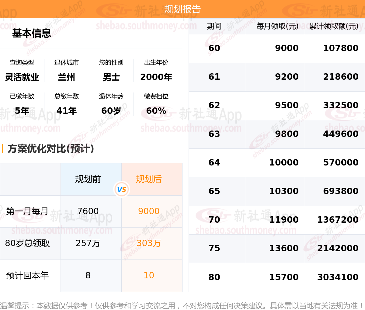 规划前:参保城市:甘肃兰州,性别:男士,出生年月:2000,已缴年限:5年,总缴年数:41年,退休年龄:60岁,缴费档位:60%。