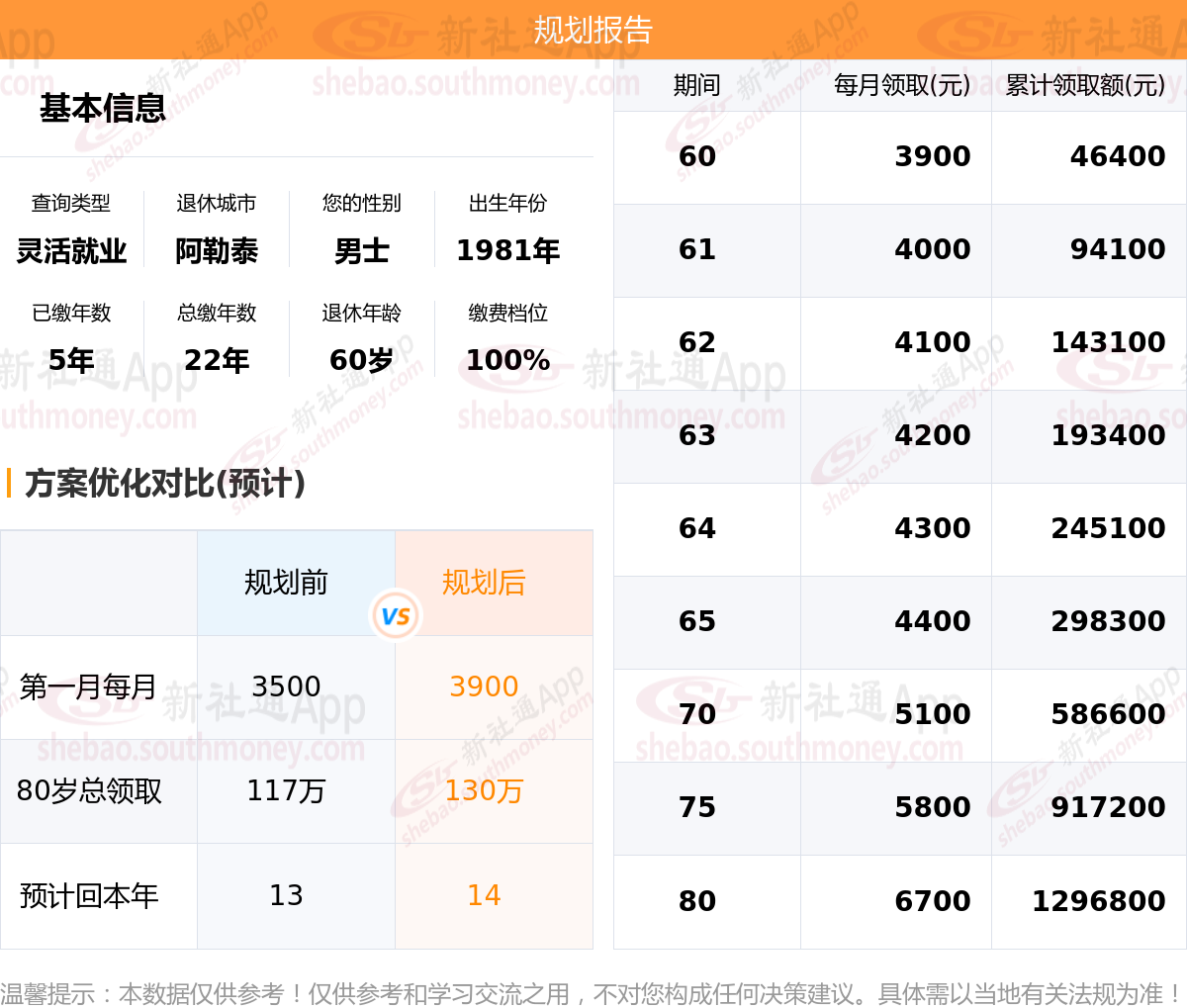 规划前:参保城市:新疆阿勒泰,性别:男士,出生年月:1981,已缴年限:5年,总缴年数:22年,退休年龄:60岁,缴费档位:100%。