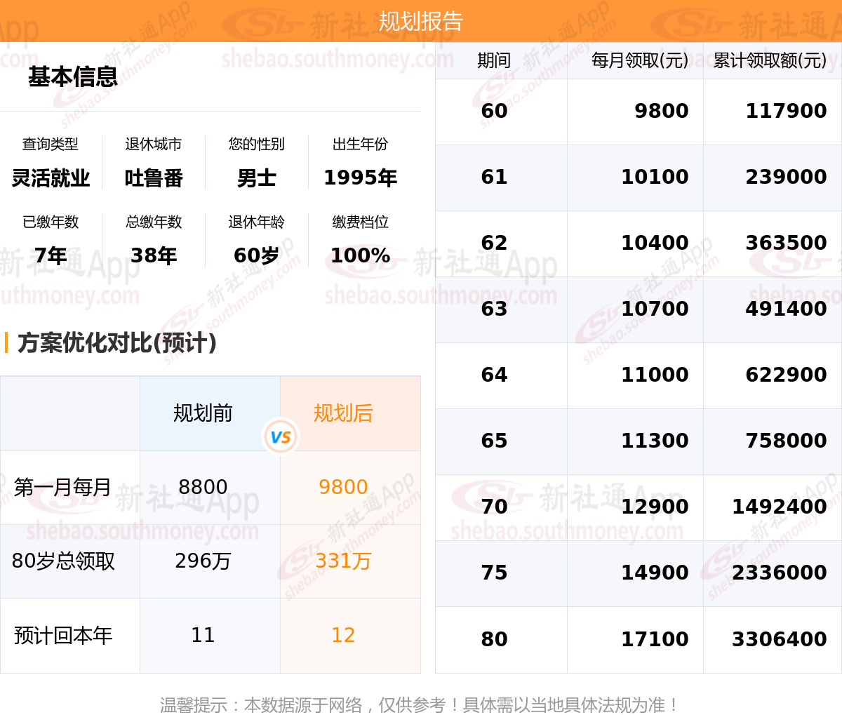 规划前:参保城市:新疆吐鲁番,性别:男士,出生年月:1995,已缴年限:7年,总缴年数:38年,退休年龄:60岁,缴费档位:100%。