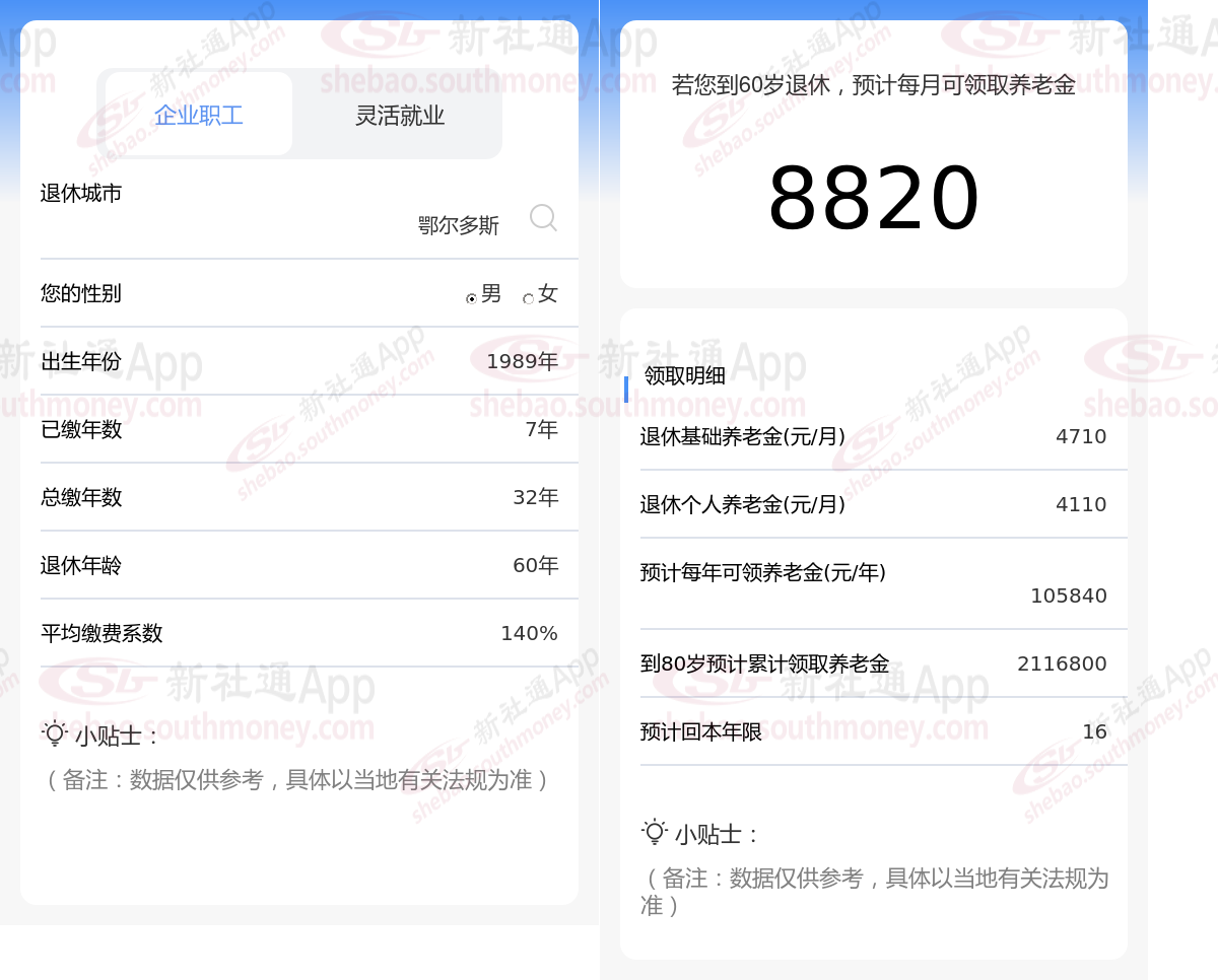 通过新社通APP-养老金计算所得:退休城市、出生年份、退休年龄、缴费系数都相同的情况下,社保缴费年限累计32年时,计算如下: