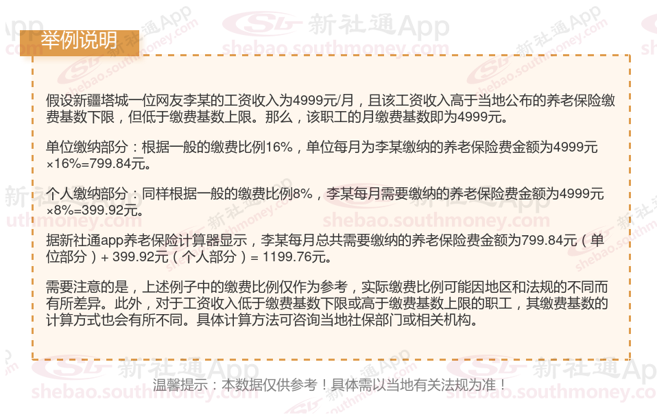 据新社通app显示,新疆塔城职工养老保险最低缴费基数为:4999元;单位和个人的缴费比例分别为:16%、8%;