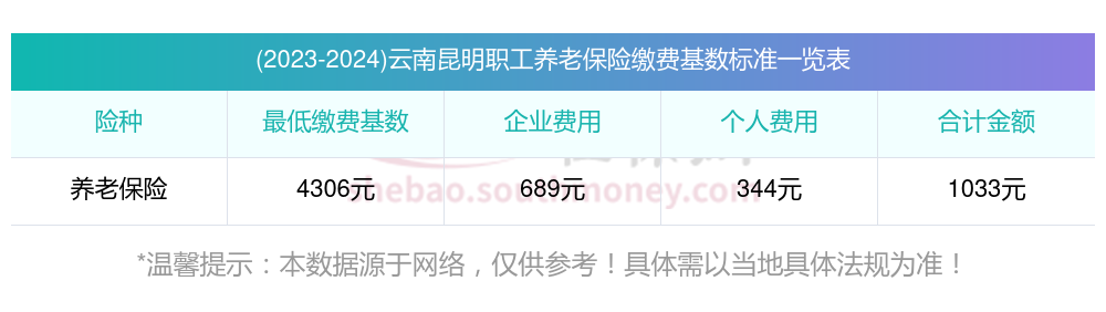 云南昆明假设某职工养老保险的缴费基数为4306元,单位缴费比例为16%,个人缴费比例为8%。
