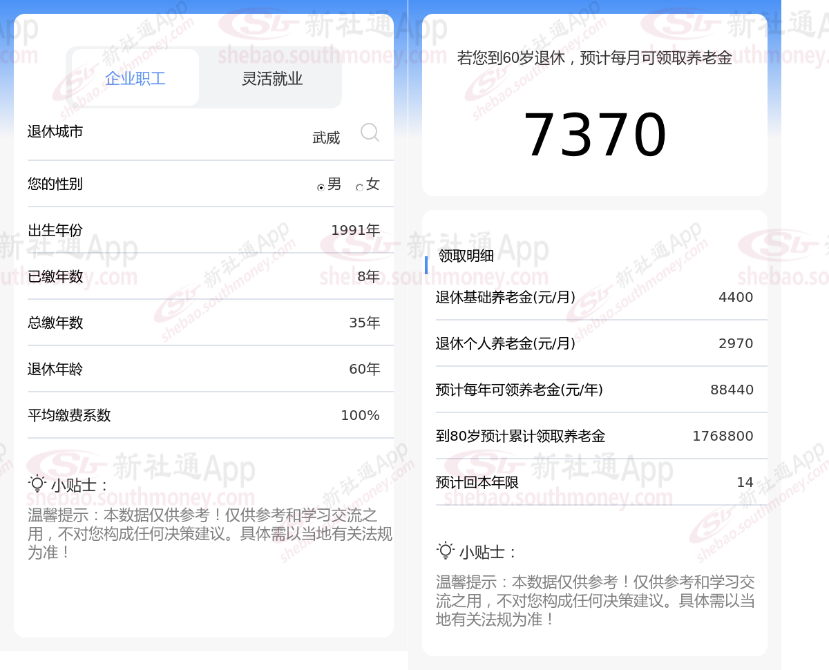 通过新社通APP-养老金计算所得:在保持退休城市、出生年份、退休年龄以及缴费系数这些条件不变的前提下,当个人的社保缴费年限累积达到35年时,其相关计算方式如下: