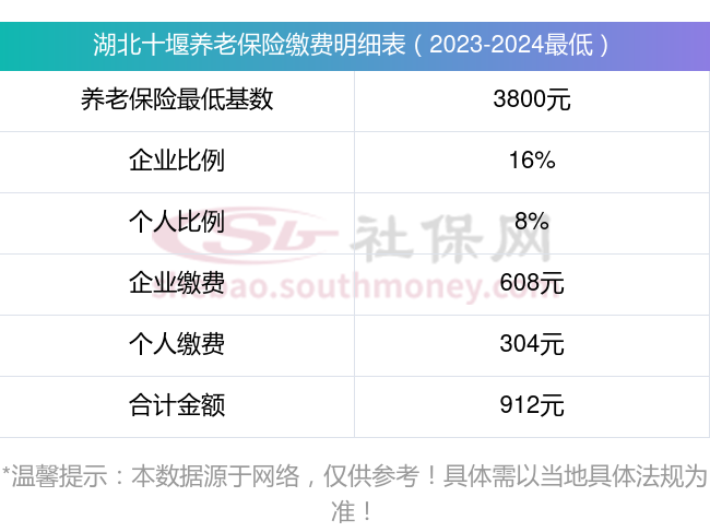 2024年湖北十堰城镇职工基本养老保险缴费基数的下限为3800元。湖北十堰职工基本养老保险由用人单位和职工分别按其缴费基数的16%和8%按月共同缴纳。湖北十堰养老金一个月缴费金额如下: