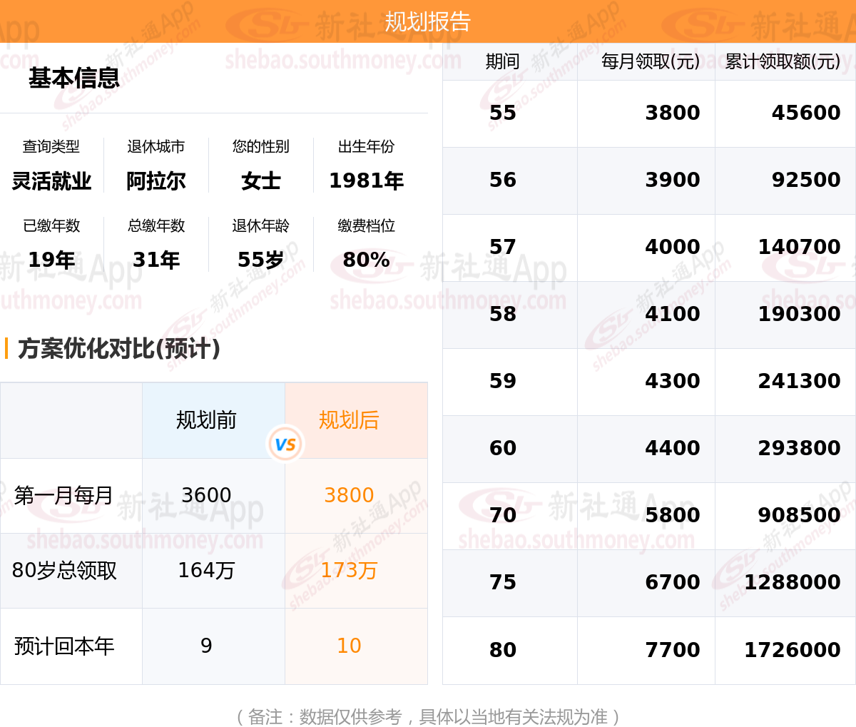规划前:参保城市:新疆阿拉尔,性别:女士,出生年月:1981,已缴年限:19年,总缴年数:31年,退休年龄:55岁,缴费档位:80%。