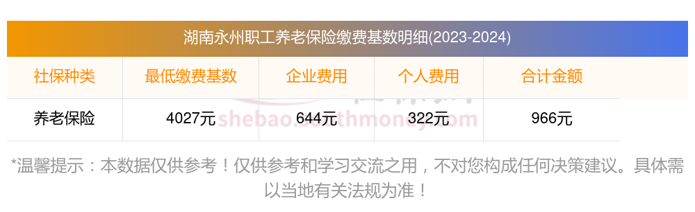湖南永州假设某职工养老保险的缴费基数为4027元,单位缴费比例为16%,个人缴费比例为8%。