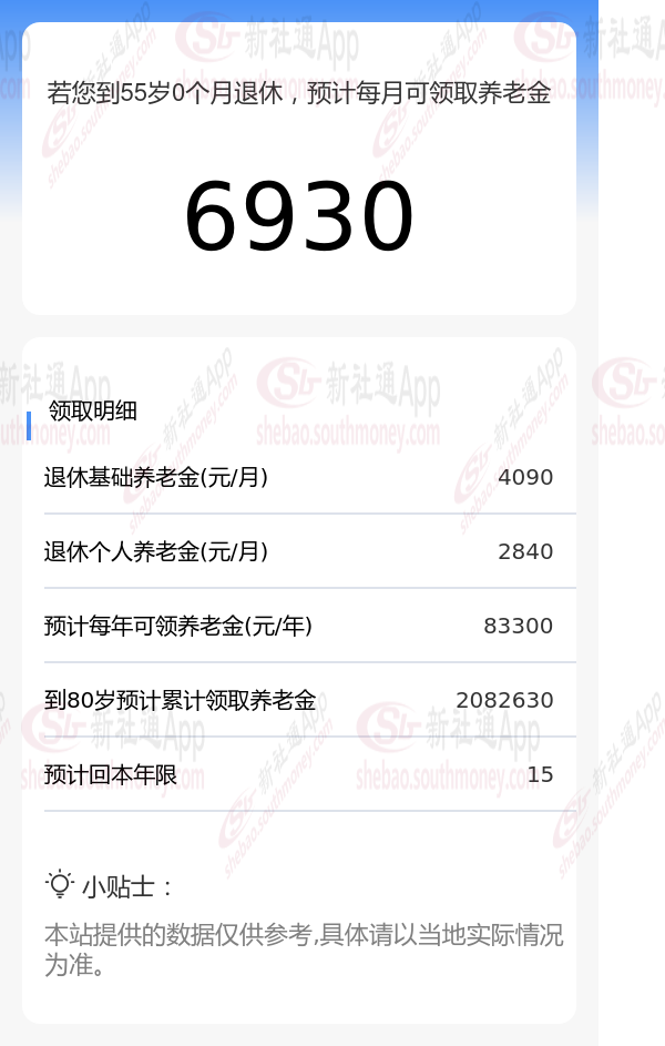 朱某,1969年出生于连云港,是一位拥有28年社保缴费记录的退休职工,缴费档次为240%。辛勤工作多年后,她迎来了退休生活。通过新社通app养老金计算器计算所得,朱某得知自己每月可以领取到基础养老金约4090元,加上个人养老金约2840元,总计6930元。虽然金额不算多,但对于朱某来说,这是一份稳定的收入来源,为她的退休生活增添了一份安心与保证。