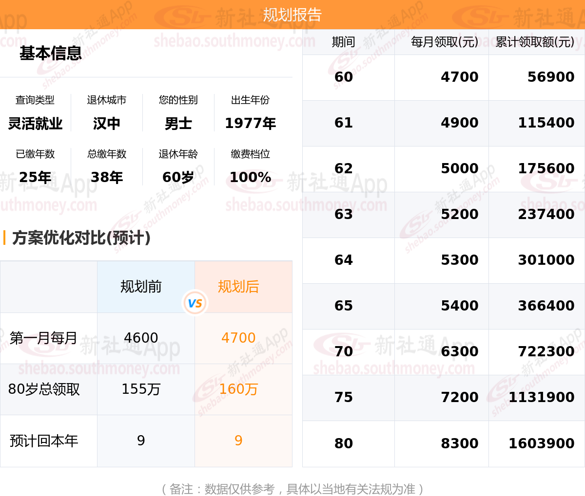 规划前:参保城市:陕西汉中,性别:男士,出生年月:1977,已缴年限:25年,总缴年数:38年,退休年龄:60岁,缴费档位:100%。