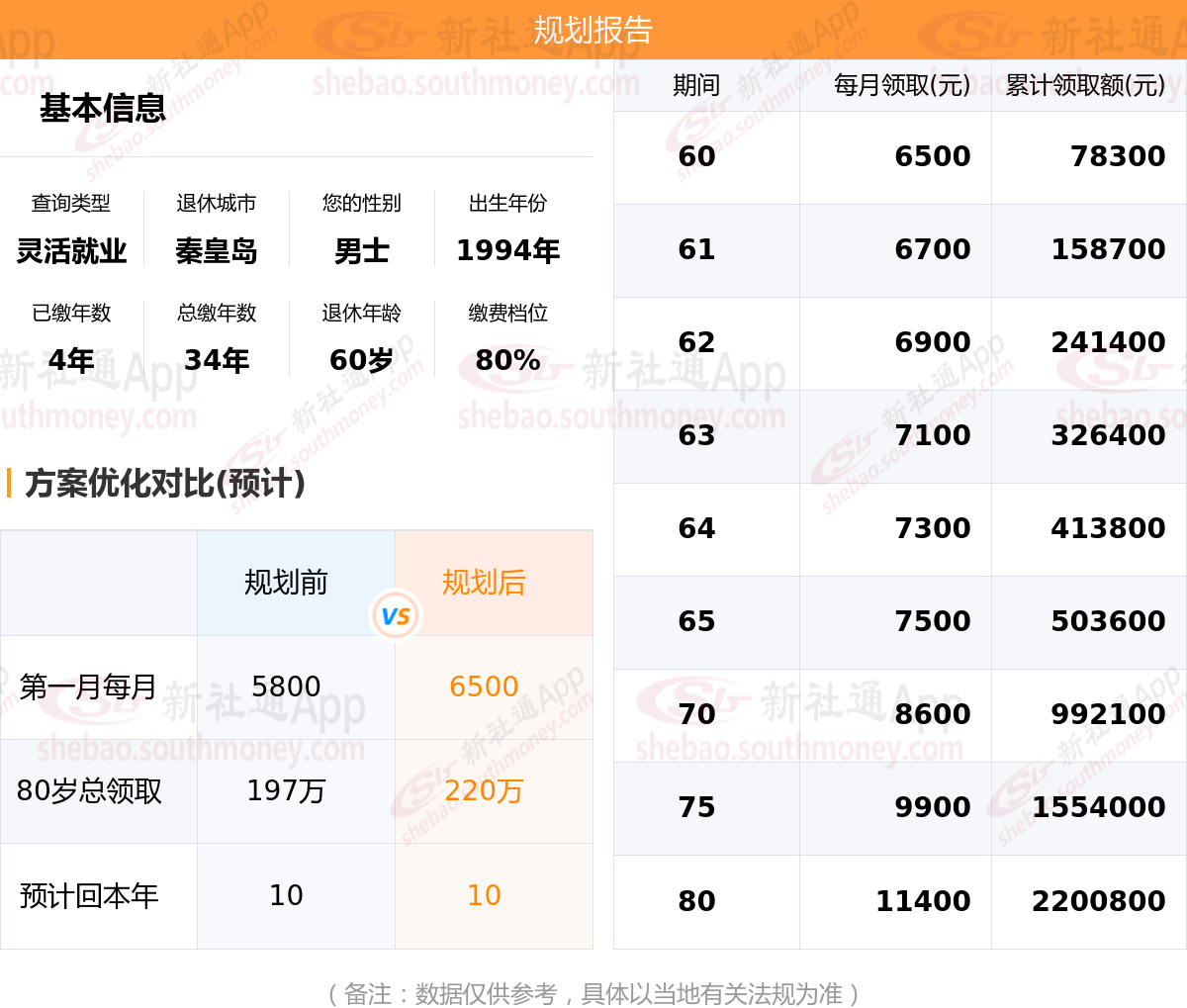 规划前:参保城市:河北秦皇岛,性别:男士,出生年月:1994,已缴年限:4年,总缴年数:34年,退休年龄:60岁,缴费档位:80%。