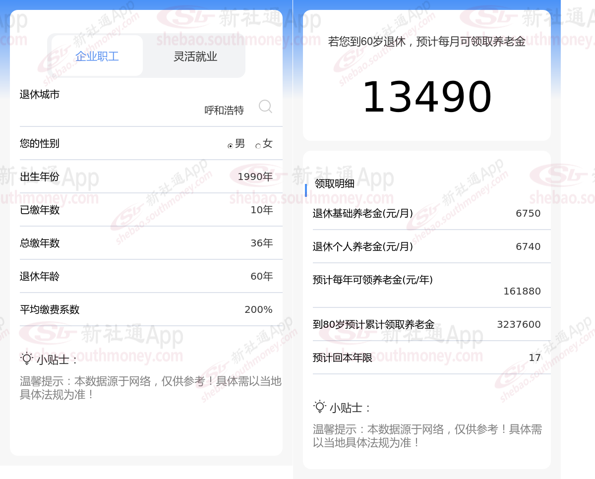 通过新社通APP-养老金计算所得:退休城市、出生年份、退休年龄、缴费系数都相同的情况下,社保缴费年限累计36年时,计算如下: