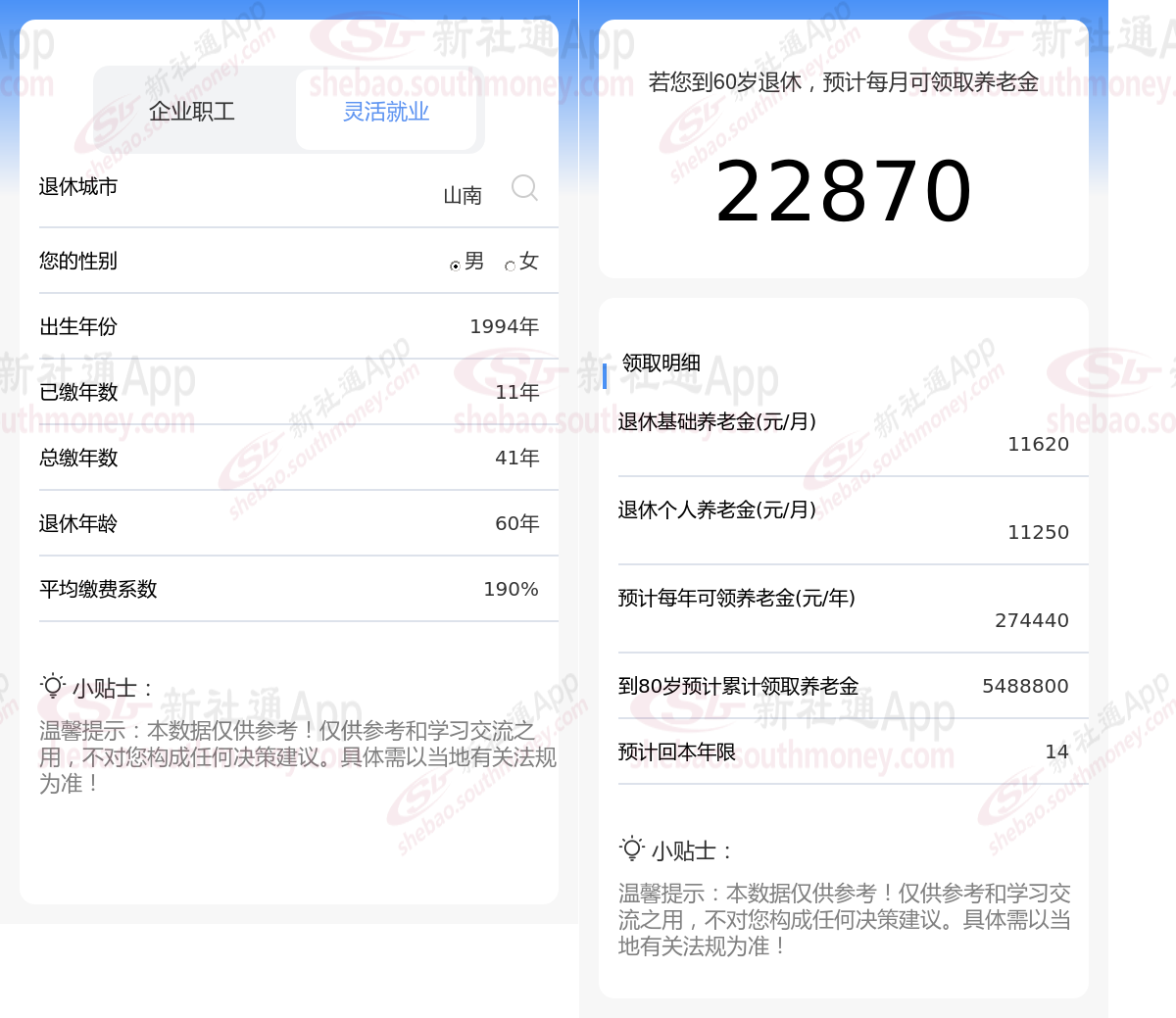 通过新社通APP-养老金计算所得:假设都在山南退休、出生年份、退休年龄和缴费系数均保持不变的情况下,若个人的社保缴费年限累计达到41年,那么其相关计算方式如下: