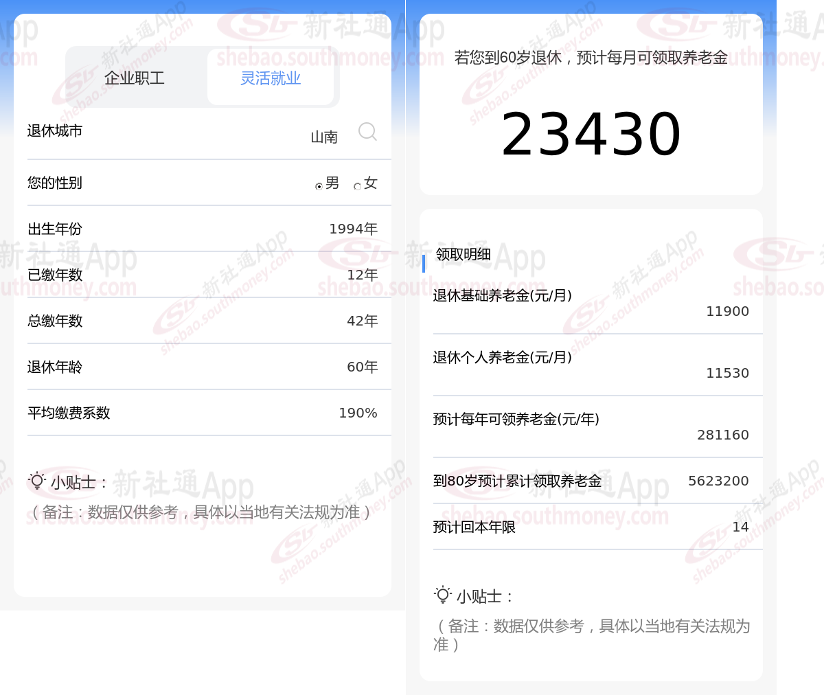 通过新社通APP-养老金计算所得:假设都在山南退休、出生年份、退休年龄和缴费系数均保持不变的情况下,若个人的社保缴费年限累计达到42年,那么其相关计算方式如下: