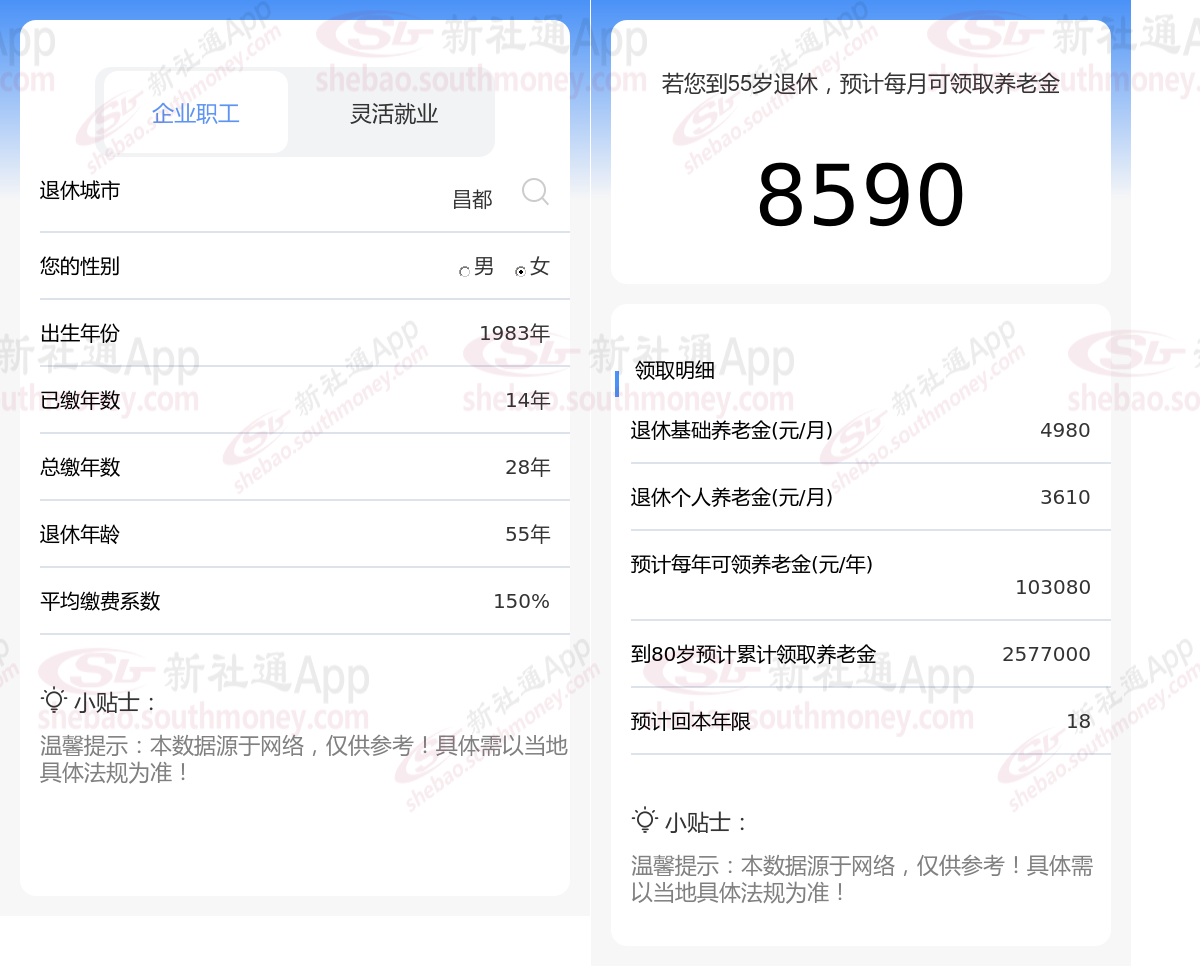 通过新社通APP-养老金计算所得:在保持退休城市、出生年份、退休年龄以及缴费系数这些条件不变的前提下,当个人的社保缴费年限累积达到33年时,其相关计算方式如下: