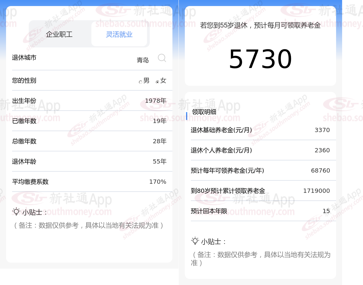 通过新社通APP-养老金计算所得:假设都在青岛退休、出生年份、退休年龄和缴费系数均保持不变的情况下,若个人的社保缴费年限累计达到28年,那么其相关计算方式如下: