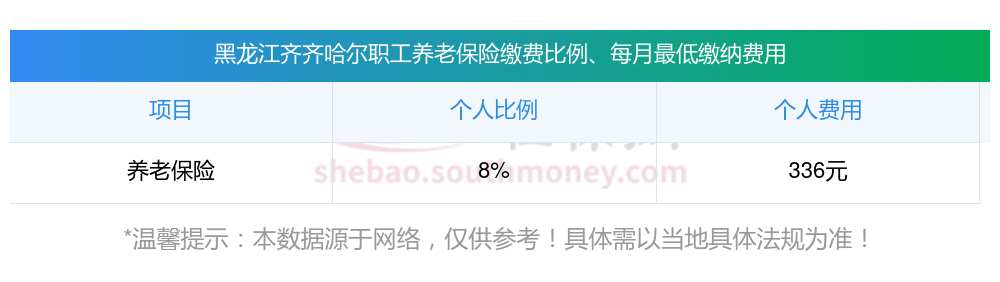 黑龙江齐齐哈尔养老保险缴费基数2023-2024年最新标准(最低)要交多少钱一个月?