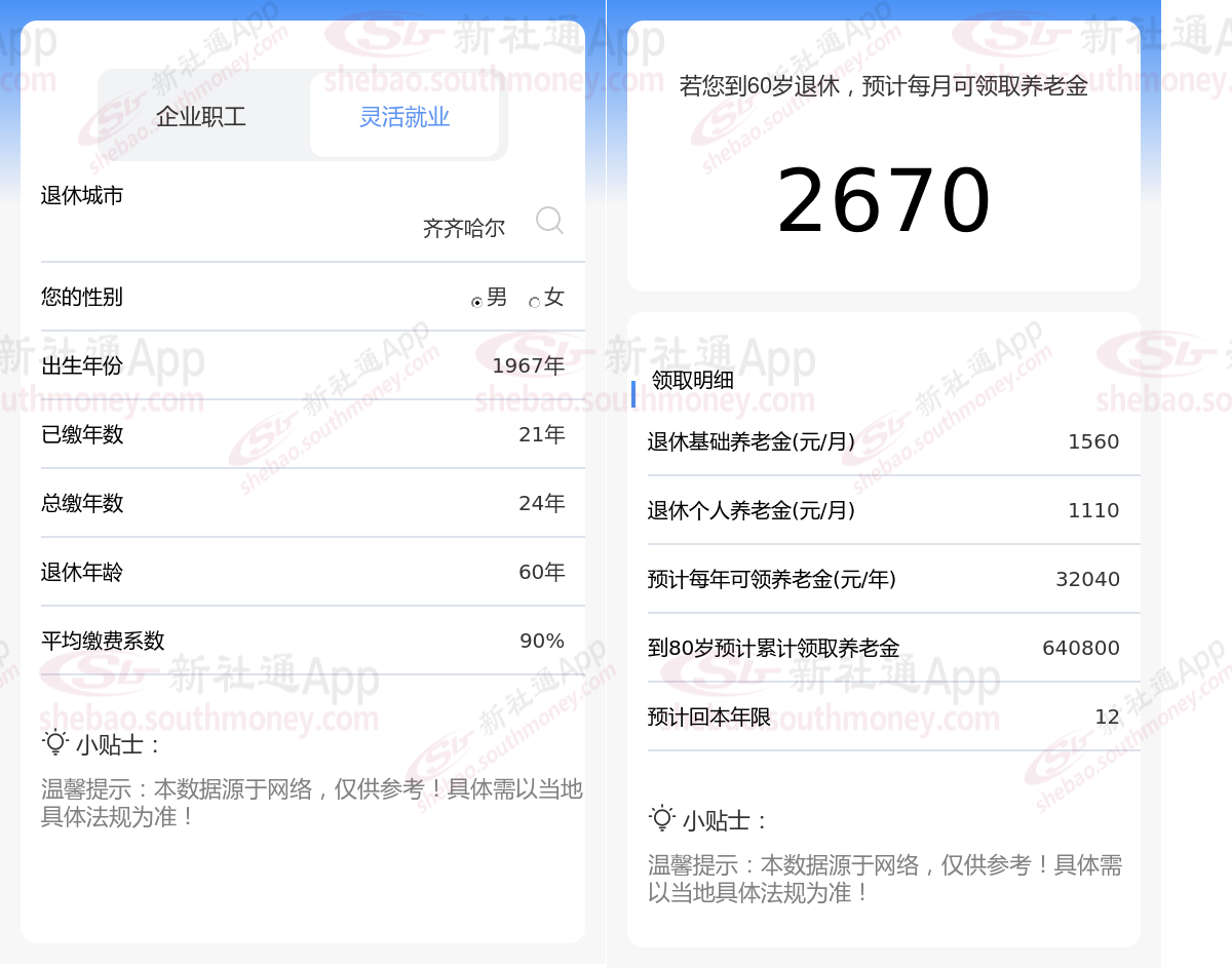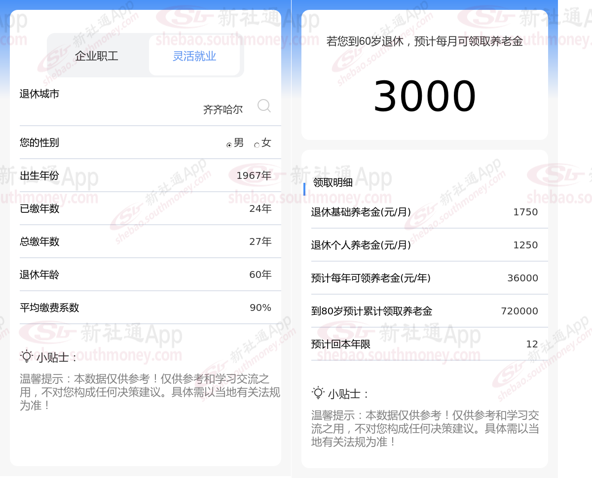通过新社通APP-养老金计算所得:退休城市、出生年份、退休年龄、缴费系数都相同的情况下,社保缴费年限累计24年时,计算如下: