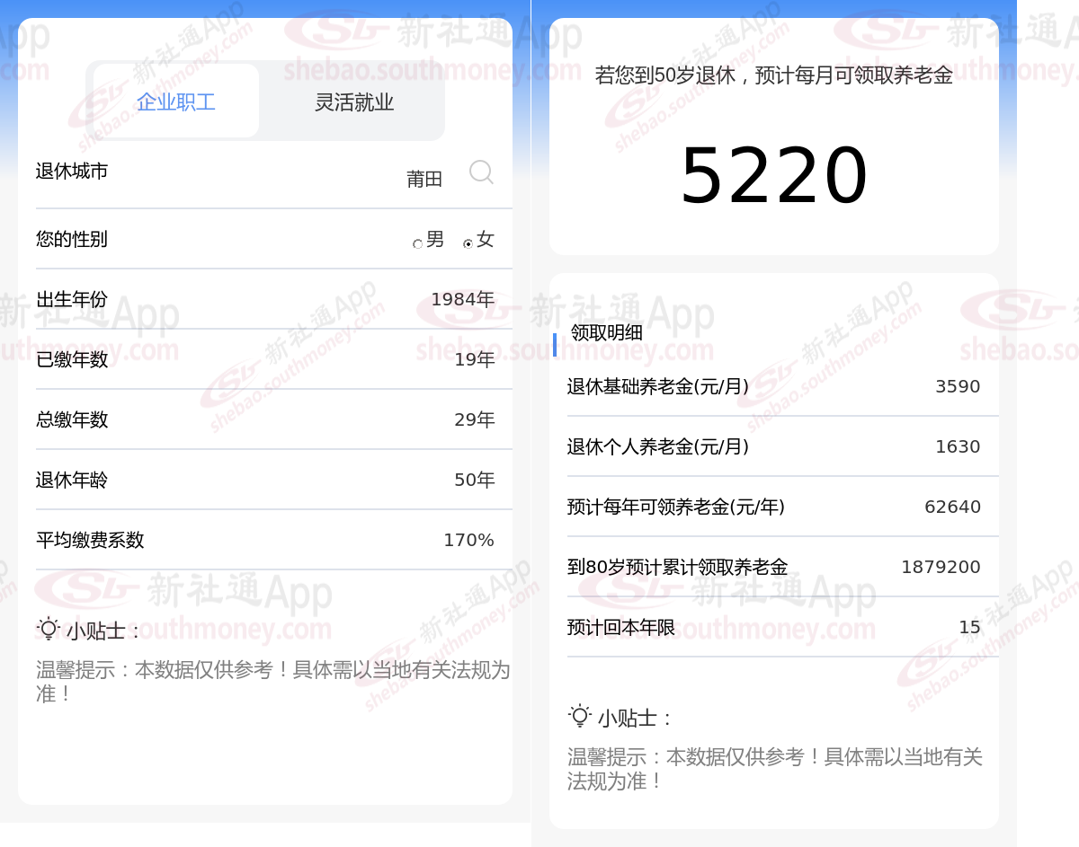 通过新社通APP-养老金计算所得:假设都在莆田退休、出生年份、退休年龄和缴费系数均保持不变的情况下,若个人的社保缴费年限累计达到29年,那么其相关计算方式如下: