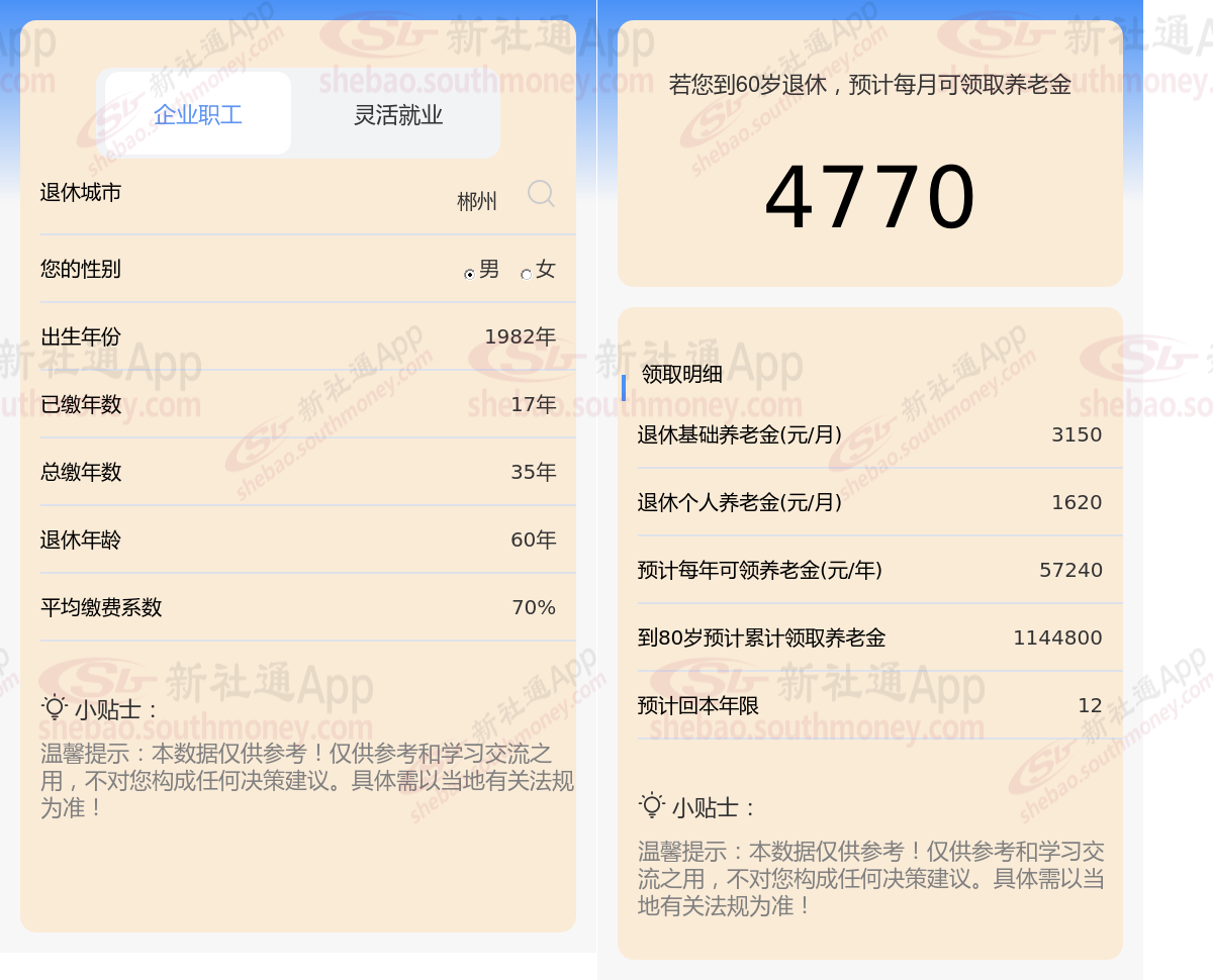 通过新社通APP-养老金计算所得:退休城市、出生年份、退休年龄、缴费系数都相同的情况下,社保缴费年限累计35年时,计算如下: